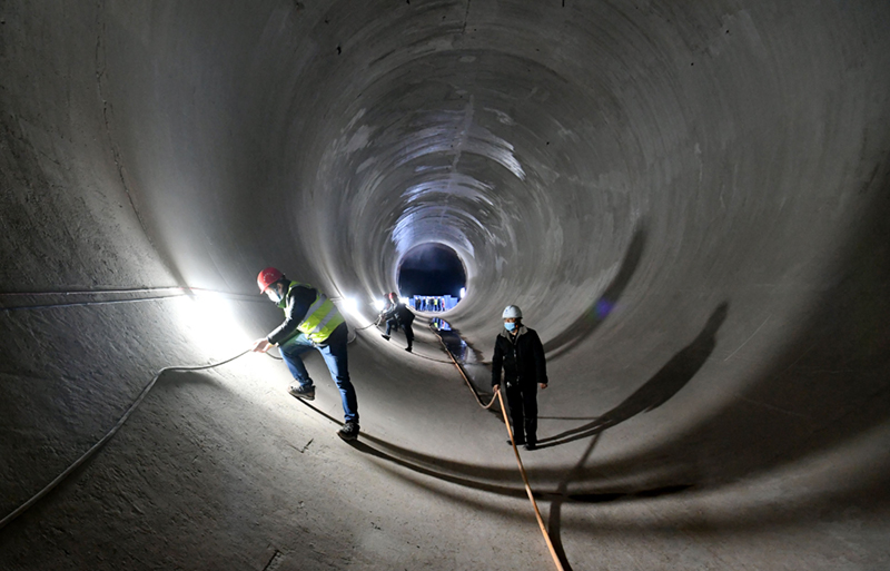 工作人員正在向家壩灌區(qū)北總干渠一期工程龍洞巖隧洞工程內(nèi)檢查電纜