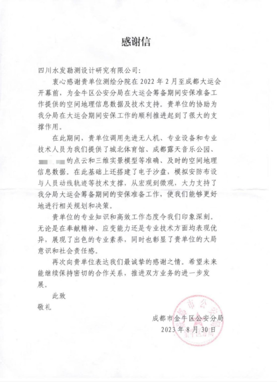 信中指出,設(shè)計公司測繪分院在大運會籌備期間所展現(xiàn)出的專業(yè)知識和高效的工作態(tài)度令金牛區(qū)公安分局印象深刻,無論是在奉獻(xiàn)精神、應(yīng)變能力還是專業(yè)技術(shù)方面均表現(xiàn)優(yōu)異,展現(xiàn)了出色的專業(yè)素養(yǎng),同時也彰顯了設(shè)計公司的大局意識和社會責(zé)任感。