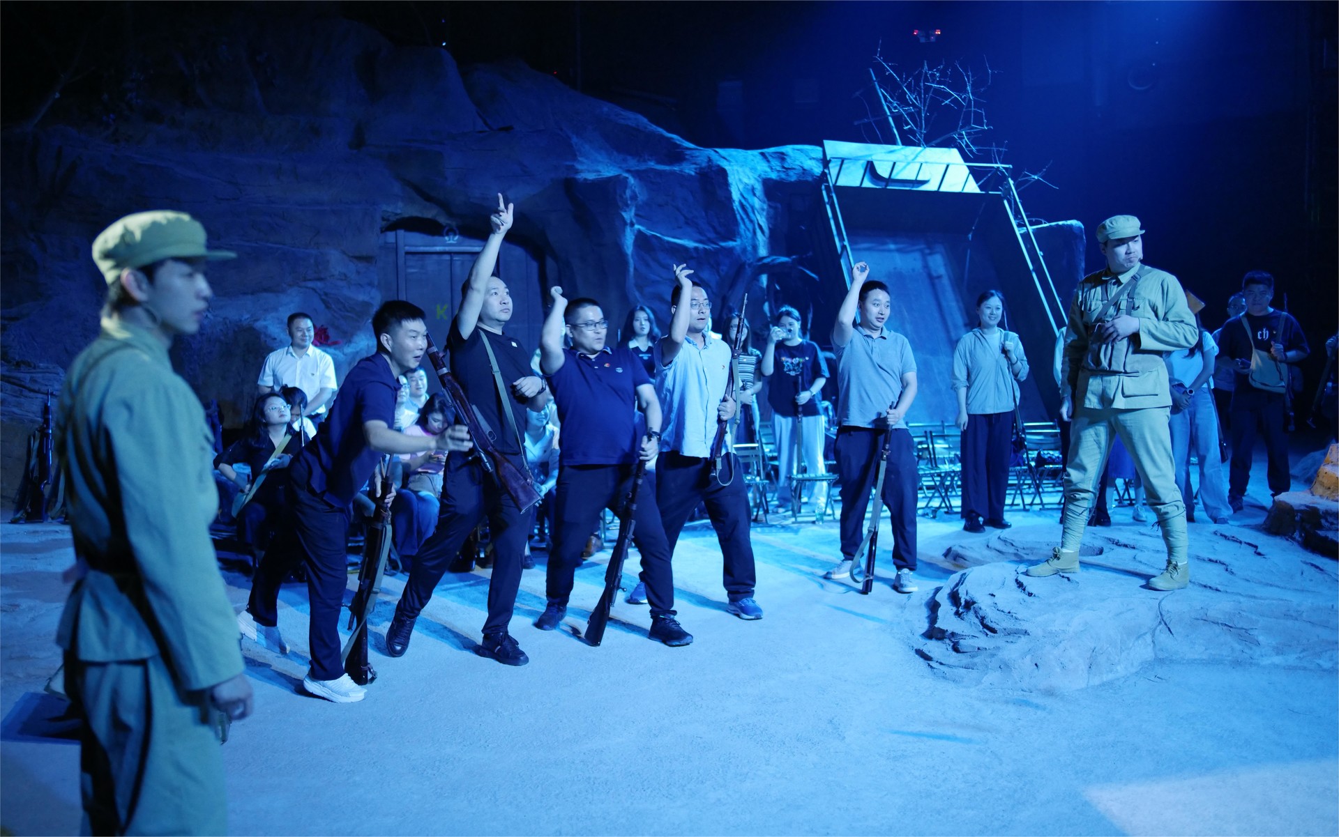“同志們,你們準(zhǔn)備好了嗎?”“準(zhǔn)備好啦!”參觀完紅色文化長(zhǎng)廊,大家整齊列隊(duì)進(jìn)入沉浸式劇場(chǎng),在充滿(mǎn)歷史感的環(huán)境中,駐足2024、回望1953。通過(guò)家鄉(xiāng)話(huà)別、寫(xiě)家書(shū)、投擲手榴彈、坑道作戰(zhàn)、運(yùn)送物資等環(huán)節(jié)沉浸式體驗(yàn)硝煙彌漫的戰(zhàn)場(chǎng),先輩們的英勇事跡在全息影像中得以生動(dòng)還原,每一幀畫(huà)面都如同英雄的心跳,激發(fā)著黨員干部?jī)?nèi)心的無(wú)尚崇敬和愛(ài)國(guó)主義情懷。在虛擬與現(xiàn)實(shí)交融的舞臺(tái)上,大家觸摸歷史的脈搏,集體莊重許下弘揚(yáng)偉大抗美援朝精神建設(shè)四川水網(wǎng)的莊嚴(yán)承諾。