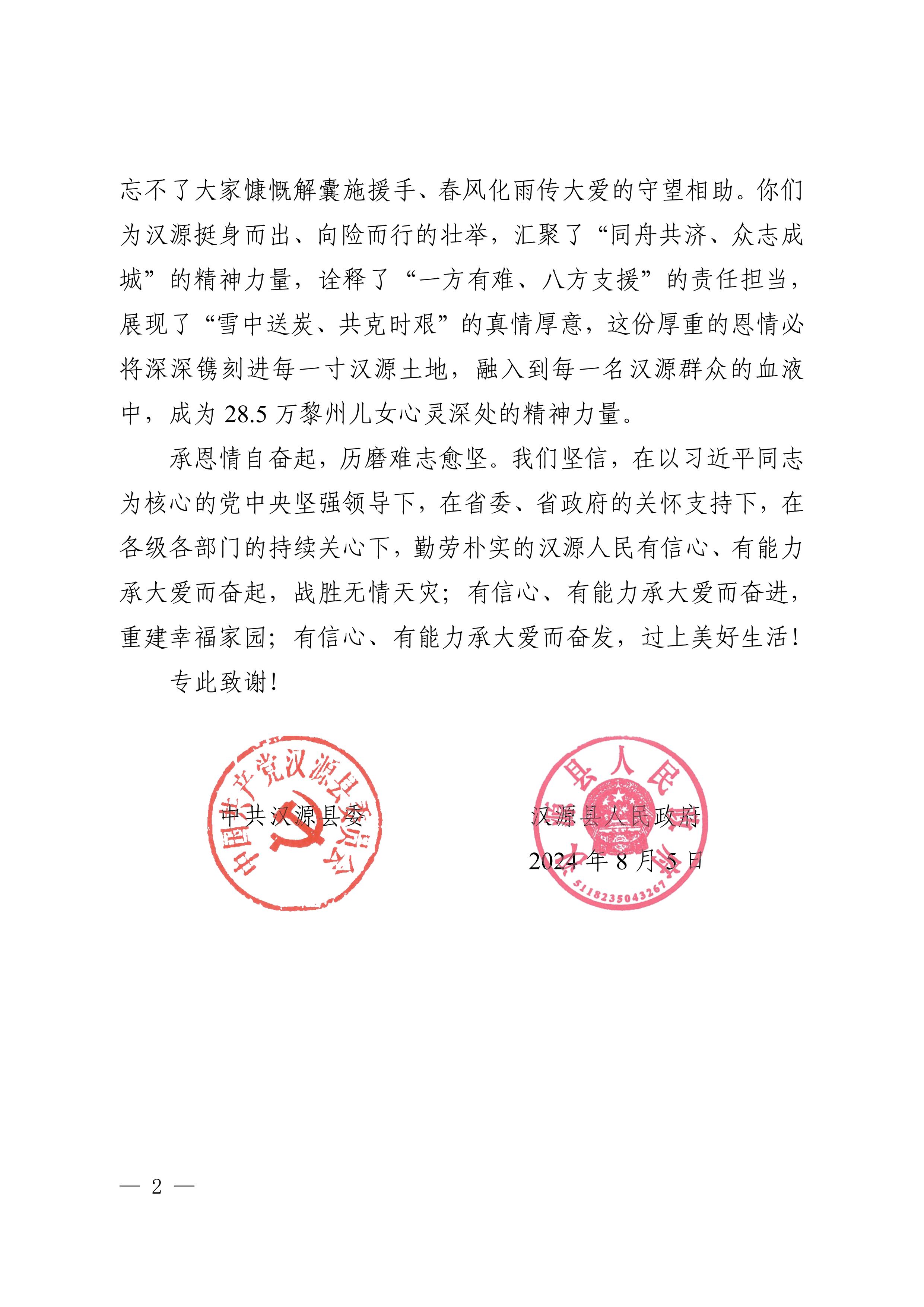日前,集團收到來自中共漢源縣委、漢源縣人民政府的感謝信,信中對集團在“7?20”漢源縣馬烈鄉(xiāng)突發(fā)山洪泥石流災害應急搶險救災中迅速響應、行動有力表示了衷心的感謝,對搶險人員的日夜堅守和全力以赴表達了崇高的敬意。