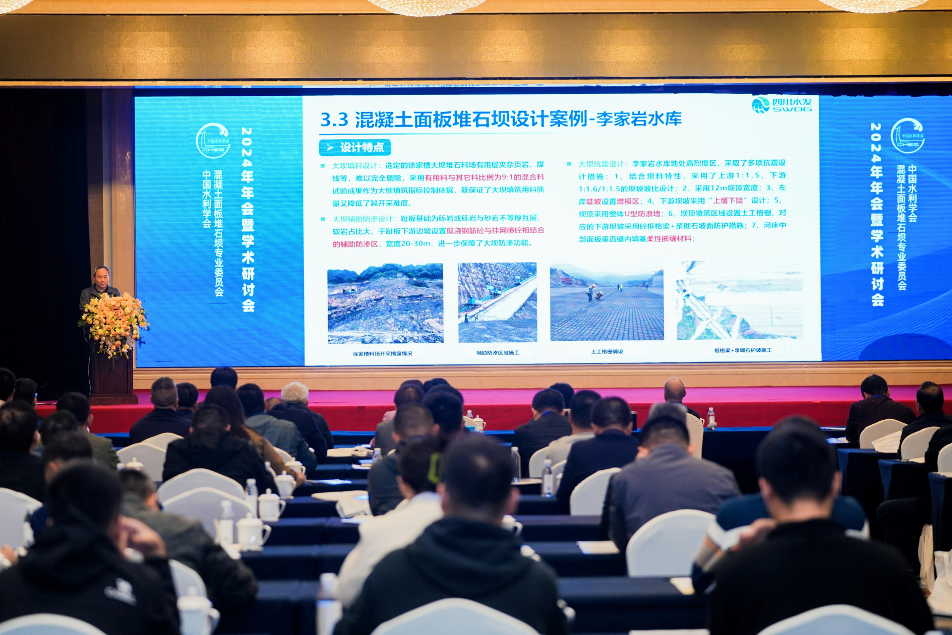 會(huì)議開幕式由中國(guó)水利學(xué)會(huì)混凝土面板堆石壩專業(yè)委員會(huì)副主任委員遲守旭主持,中國(guó)水利學(xué)會(huì)混凝土面板堆石壩專業(yè)委員會(huì)主任委員李現(xiàn)社致歡迎辭,四川省水利廳副廳長(zhǎng)權(quán)燕為大會(huì)致辭,四川省水利發(fā)展集團(tuán)有限公司黨委書記、董事長(zhǎng)王華作開場(chǎng)講話。四川省勘察設(shè)計(jì)大師高希章,設(shè)計(jì)公司黨委副書記、董事、總經(jīng)理張宏受邀出席會(huì)議,設(shè)計(jì)公司黨委委員、總工程師杜鵬作為特邀專家出席并作學(xué)術(shù)報(bào)告,公司共有30余名專業(yè)技術(shù)人員參會(huì)。